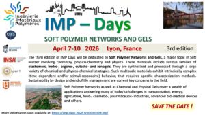 atelier Related postsConférence IMP days 2026 : “Soft Polymer Networks and Gels”18 June 2025Seminar of Pr. Bluma Guenther Soares4 November 2024PhD Defense Emna MASGHOUNI15 October 2024 Previous post1st IMPressionNext postPresentation of the first work of the PEPR DIADEM AMETHYST on the accelerated discovery of polymers materials by tools using Artificial Intelligence by Aymar Tchagoue during the 51st annual GFP conference
